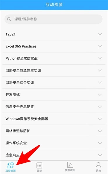 2.登录后点击底部的“互动资源”选项进入课程列表页面,在这里可以浏览各类课程以及实训相关内容,便于开展自主学习活动。