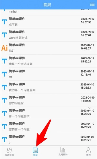 3.点击底部的“答疑”模块进入提问区域,在这里你可以查看自己已经提交的问题,并且能够接收教师的答复,该功能支持多种不同的回复方式。