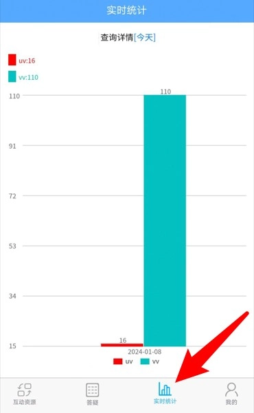5.点击底部的“实时统计”栏目,就能查看学习访问数据图表,从而清晰了解课程浏览量和活跃度的变化情况。