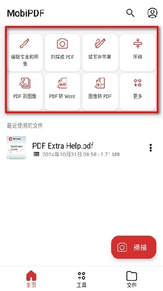在首页能够找到编辑文本和图像、扫描生成PDF、压缩文件、PDF转换为Word、图像转换为PDF等各类功能。