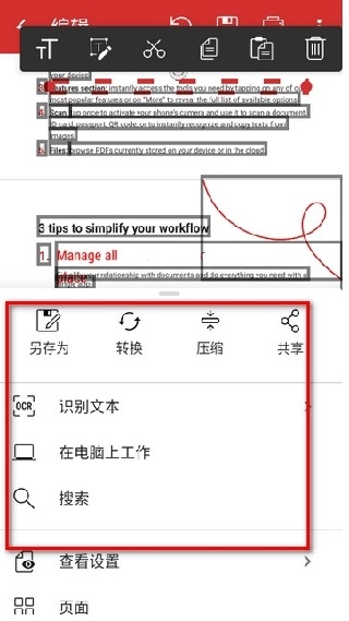 处理完成的PDF文件,点击顶部菜单栏即可进行转换、另存为、压缩以及保存分享等操作。
