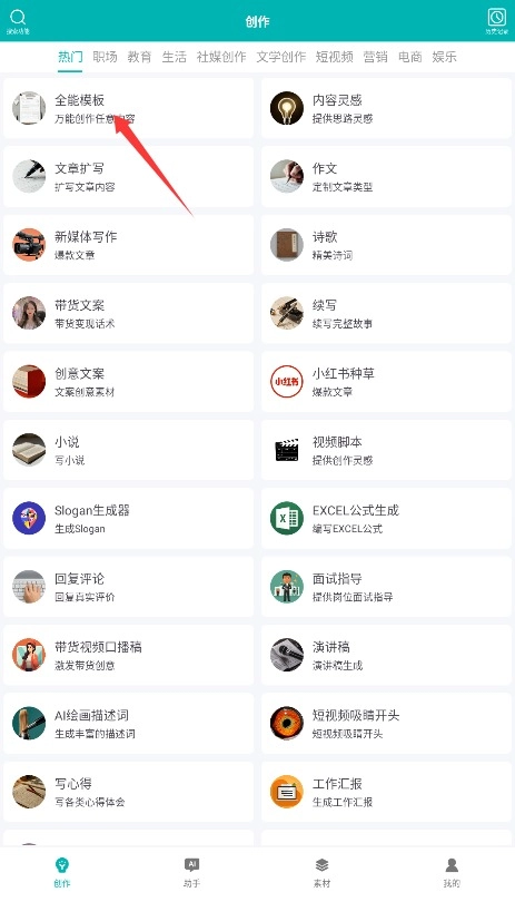 2、进入文案创作界面后,可从丰富的预设模板中挑选契合自身需求的文案类型,以此开启创作流程。