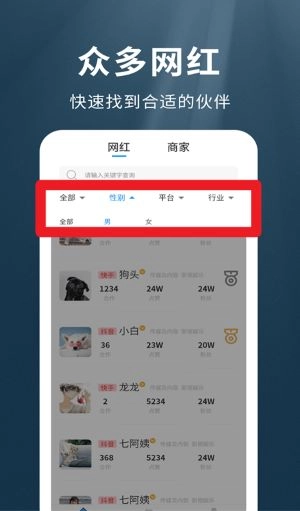 3、借助网红筛选界面,能够根据性别、平台等条件,精准定位到合适的合作达人。