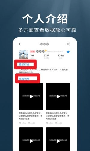 4、进入个人介绍页面后,能够查看达人擅长的行业领域以及代表作品,以此让合作更具保障。