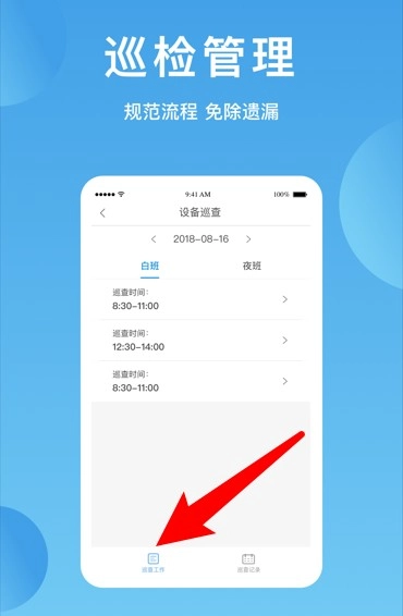 3、点击底部的“巡查工作”按钮,进入设备巡查模块后,按照时间段来安排并执行巡检任务流程。