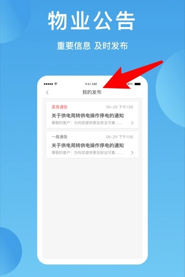 4、进入“我的发布”页面能够查看已发布的物业公告,支持对紧急公告和普通通知进行分类管理。
