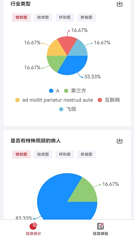 3、借助饼状图、柱状图等多样化的图表样式来展示业主行业、特殊病人等相关数据,呈现效果直观且清晰。