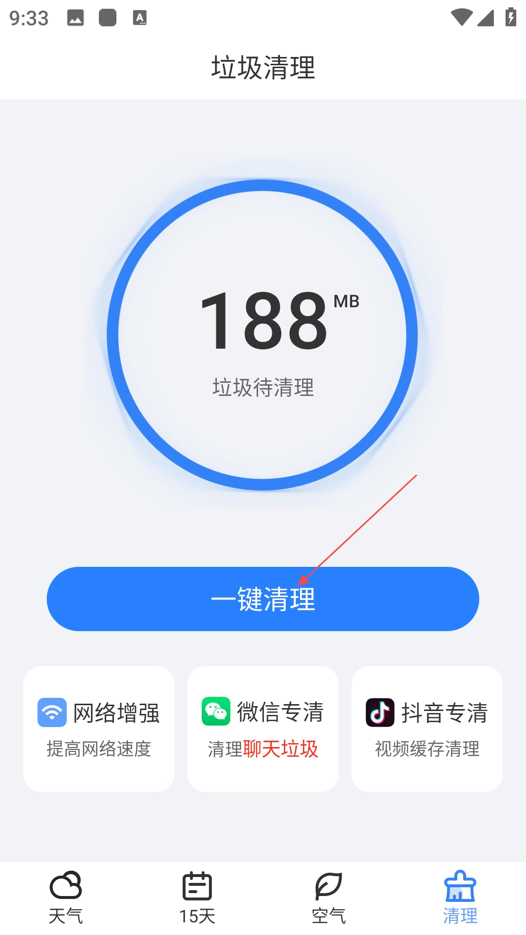 打开【清理】页面,找到并点击【一键清理】按钮,系统会自动完成扫描流程,之后直接进行清理操作就可以了。