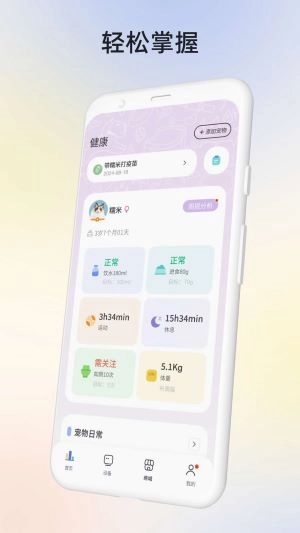 3、宠物健康数据记录系统,可自动同步宠物体重、进食量、活动轨迹等相关信息。