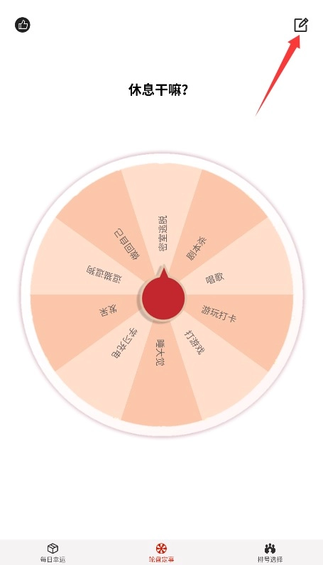 2、进入轮盘定事界面后,点击右上角的编写图标,即可进入转盘内容的自定义编辑模式。