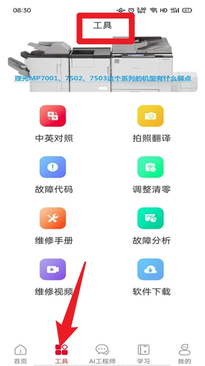 打开App后,点击底部导航栏中的“工具”选项,即可进入包含中英对照、故障代码、维修手册等在内的常用工具模块。