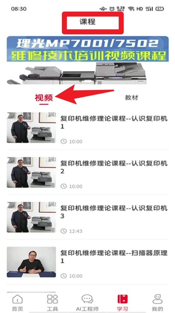 4. 点击底部的“学习”栏目,就能进入课程页面,在这里可以查看复印机维修理论课程,该课程适合想要系统学习维修知识的用户。