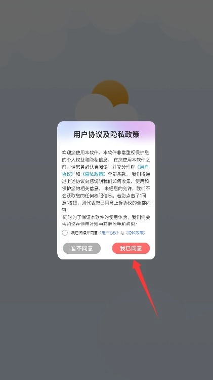 1、首次使用时,请仔细阅读平台的服务条款和隐私政策,确认无误后点击同意按钮,即可进入应用。