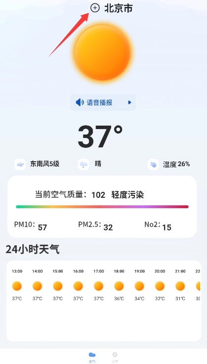 2、在天气首页点击顶部的“+”按钮,能够添加多个城市,也可以切换当前查看的城市地点。