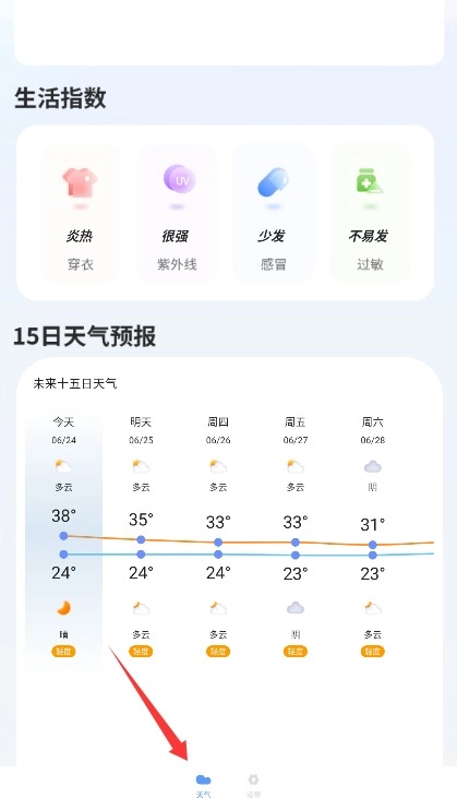 3、进入城市天气详情页面后,能够查看实时气象数据、生活建议以及未来15天的天气预报信息。