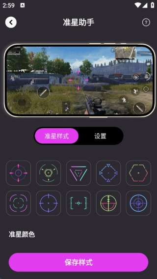 点击辅助准星进入准星助手页面,挑选准星样式后保存设置。