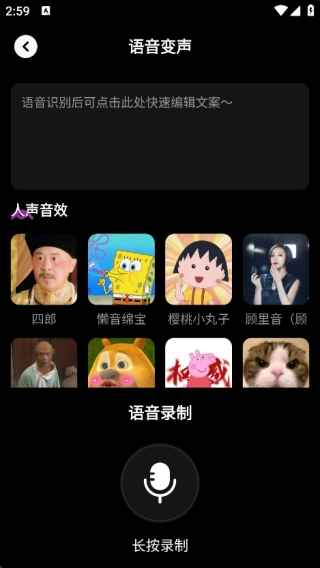 你可以先点击语音变声功能,接着输入语音内容进行识别,之后对识别出的文案进行编辑,与此同时还能挑选合适的人声音效来完成录制。