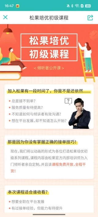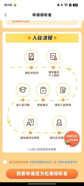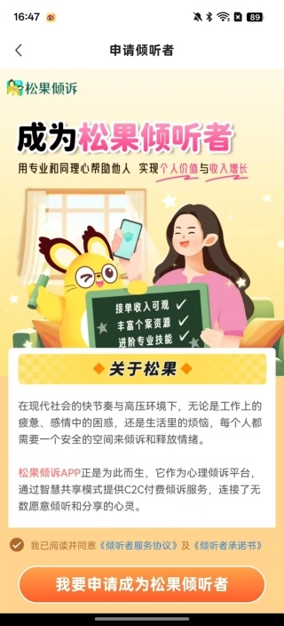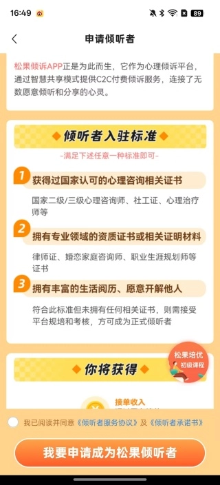 打开软件后,首先映入眼帘的是一个申请页面,上面清晰提示了成为松果倾听者的具体步骤,成为倾听者后可以凭借专业知识为他人提供帮助。