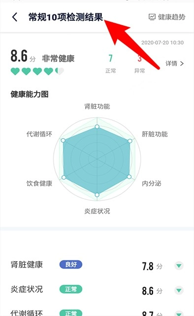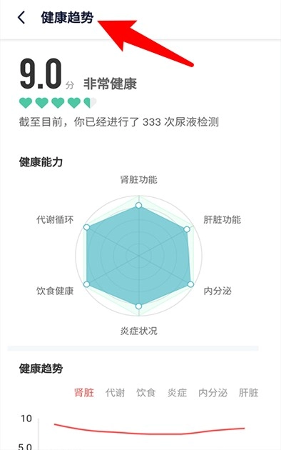 2、健康趋势页面采用雷达图形式,呈现肾脏、肝脏、内分泌等六项指标所反映的综合健康能力。