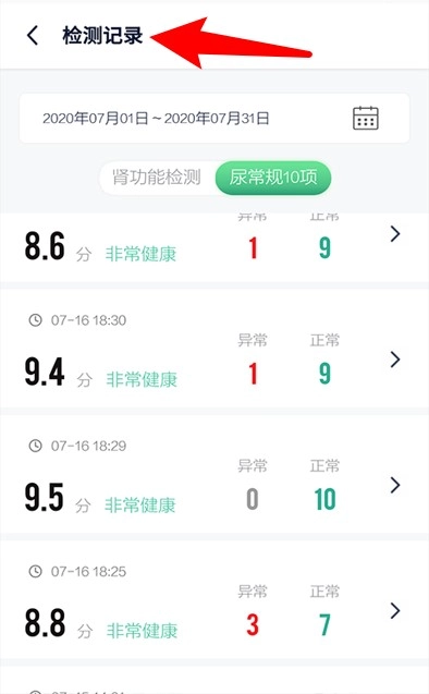 3、检测记录页面会呈现每次检测的得分与时间,同时明确标注出异常项和正常项各自的数量。