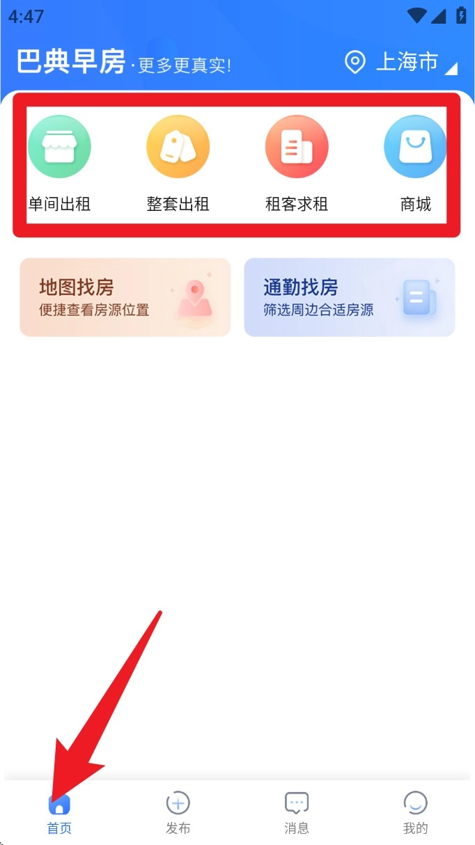 1. 打开App默认进入首页,点击上方模块可选择「单间出租」「整套出租」或「租客求租」。