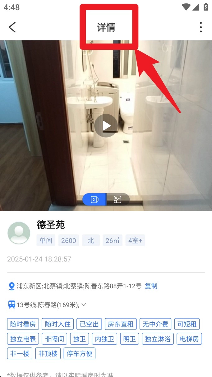 3. 点击房源图进入详情页,可浏览实拍照片、房东信息与配套说明,支持播放全景视频。
