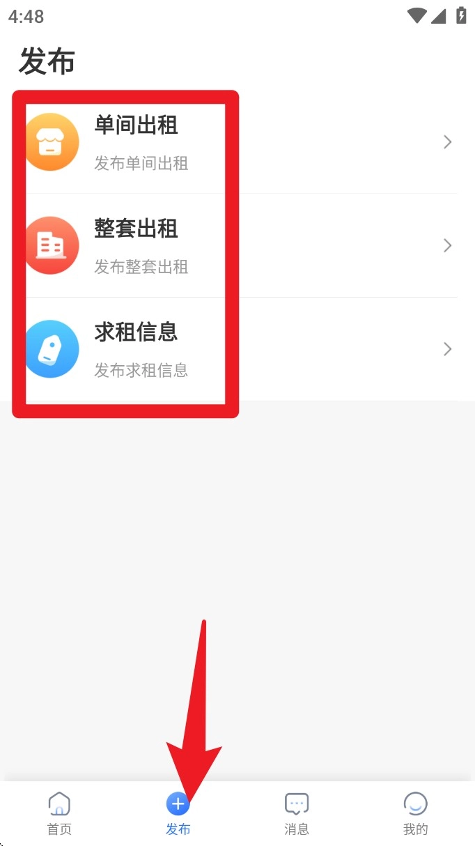 4. 若你想发布出租信息,点击底部导航栏「发布」按钮,选择对应房源类型填写资料即可。
