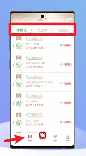 3、点击任务页面,能够查看所有待确认及处理中的工单,工单编号、时间和类别都清晰展示,方便及时进行响应。
