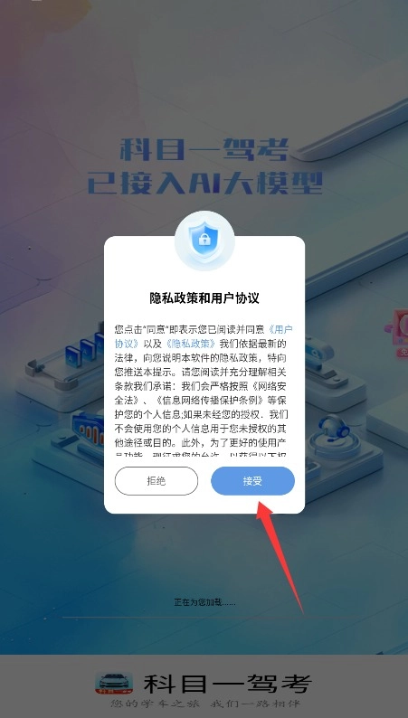 1、首次使用时,请仔细阅读平台的服务条款与隐私政策,确认无误后点击接受按钮,即可进入应用。