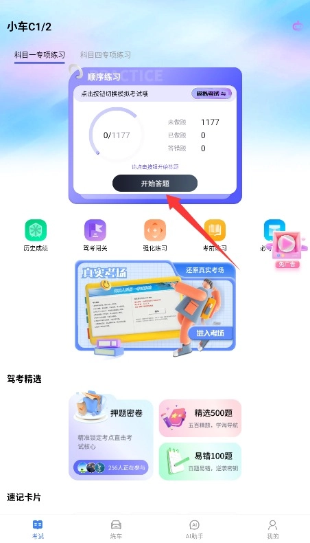 3、进入主页面后,点击“开始答题”按钮,就能进入科目一考试题库开展模拟训练。