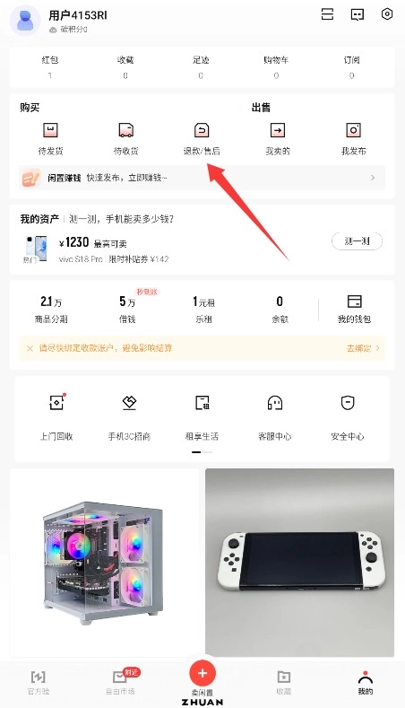 3、进入个人中心页面后,找到并点击退款/售后功能入口,接着选择你要申请退款的商品,最后点击申请售后按钮,就能提交退款请求了。
