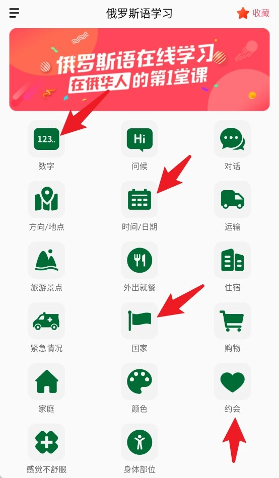 1、首页提供多种俄语学习分类主题,包括数字、国家、时间等模块,方便用户按需选择学习内容。