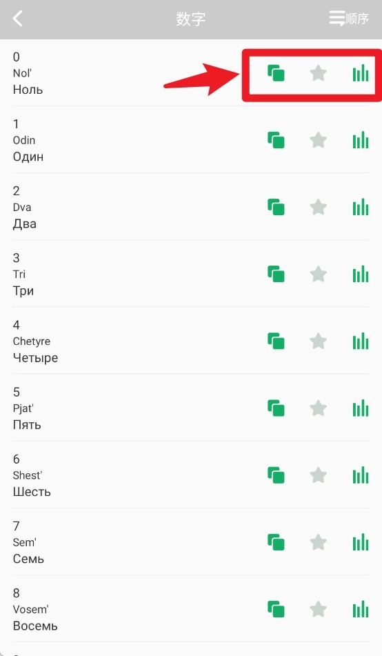 2、点击“数字”进入后可查看从0到9的俄语单词,支持查看发音、收藏及词汇使用频率。