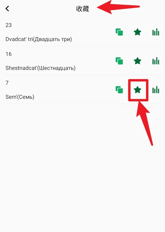 3、收藏夹页面展示用户标记的俄语单词,点击星形图标即可取消收藏,方便复习高频词汇。