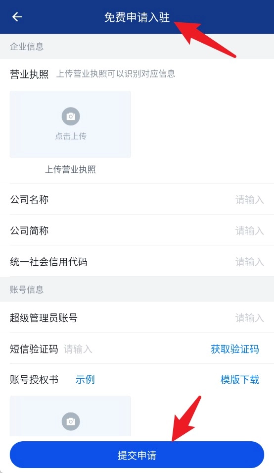 2、点击“免费申请入驻”选项,上传营业执照并填写企业相关信息,完成上述操作后提交申请资料。