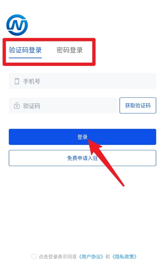 1、进入平台登录界面后,可选择验证码登录或密码登录两种方式,同时支持通过手机号进行快捷验证的操作。