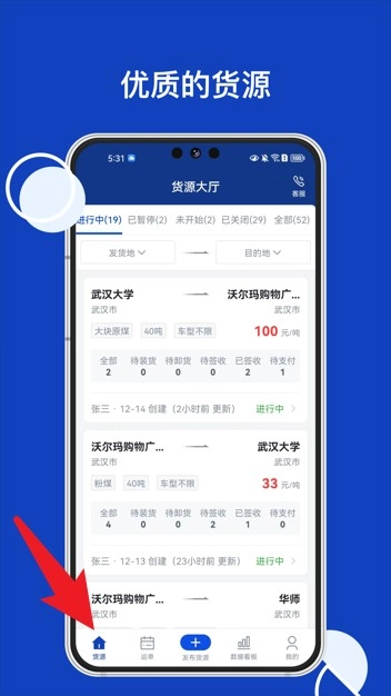 3、登录成功后进入首页的“货源”栏目,就能查看最新的货源列表,该栏目支持筛选功能和快速接单操作。