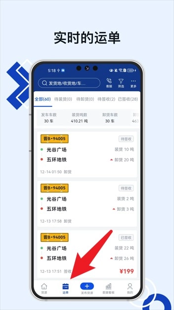 4、点击底部导航栏的“运单”图标,即可查看各类运单的实时状态以及详细的运输信息。