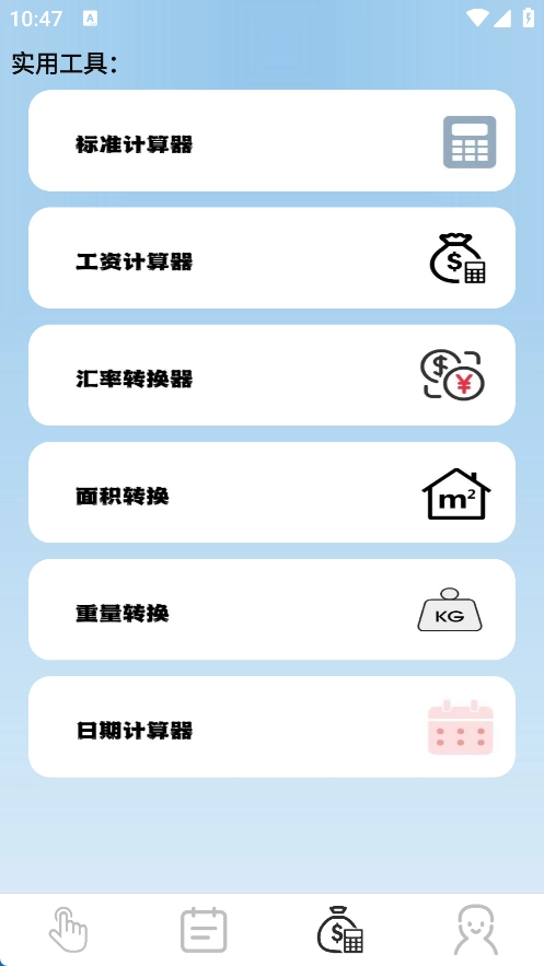 实用工具页面提供多种服务,涵盖标准计算器、工资计算器、汇率转换器、面积转换、重量转换以及日期计算器等功能。