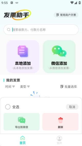 在这个软件界面就能看到所有功能,借助搜索框可以直接定位首付款方名称并快速开票,此外还支持从本地文件或微信导出相关数据。