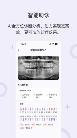 5、整合了牙列检测、龋齿识别等多种AI智能分析功能,能辅助医生更高效地判断患者的口腔健康情况。