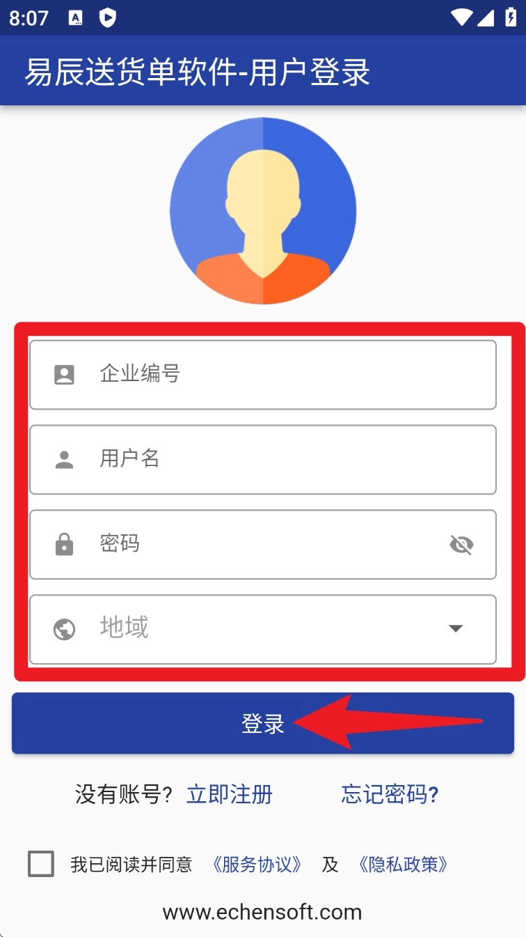 2. 返回登录界面,依次填写企业编号、用户名、密码以及所属区域信息,随后点击“登录”按钮,就能正式进入系统后台的操作界面。