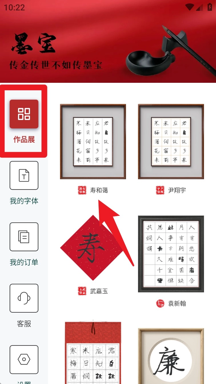 1. 打开应用程序进入首页,点击左侧导航栏里的「作品展」选项,查看平台呈现的各类用户字体作品和成品排版。