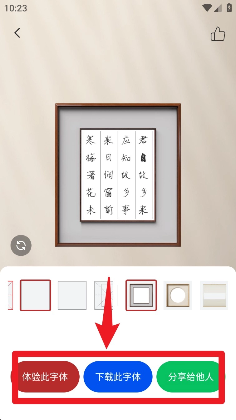 2. 当选中任意一款字体作品后,可通过点击底部的按钮,进行「体验字体」「选用此字体」或「分享给他人」等操作。