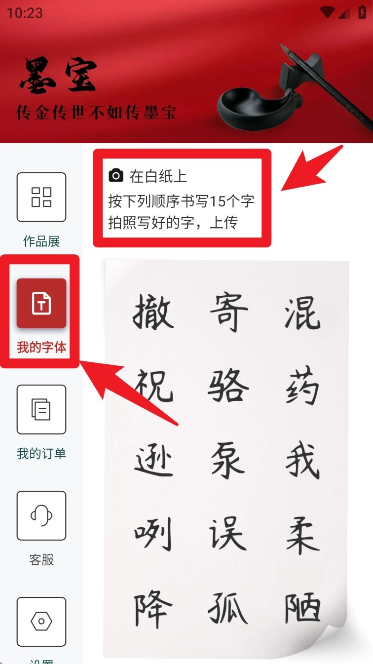 3. 切换到左侧的「我的字体」板块,在白纸上写下15个字并完成上传,就能生成专属于你的个性化字体模板了。