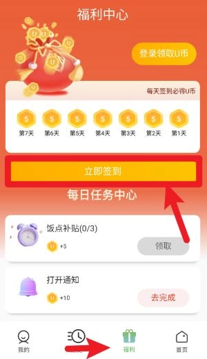 3、点击底部的“福利”按钮进入福利中心,每天签到可以领取U币,完成开启通知等任务还能获得额外奖励。