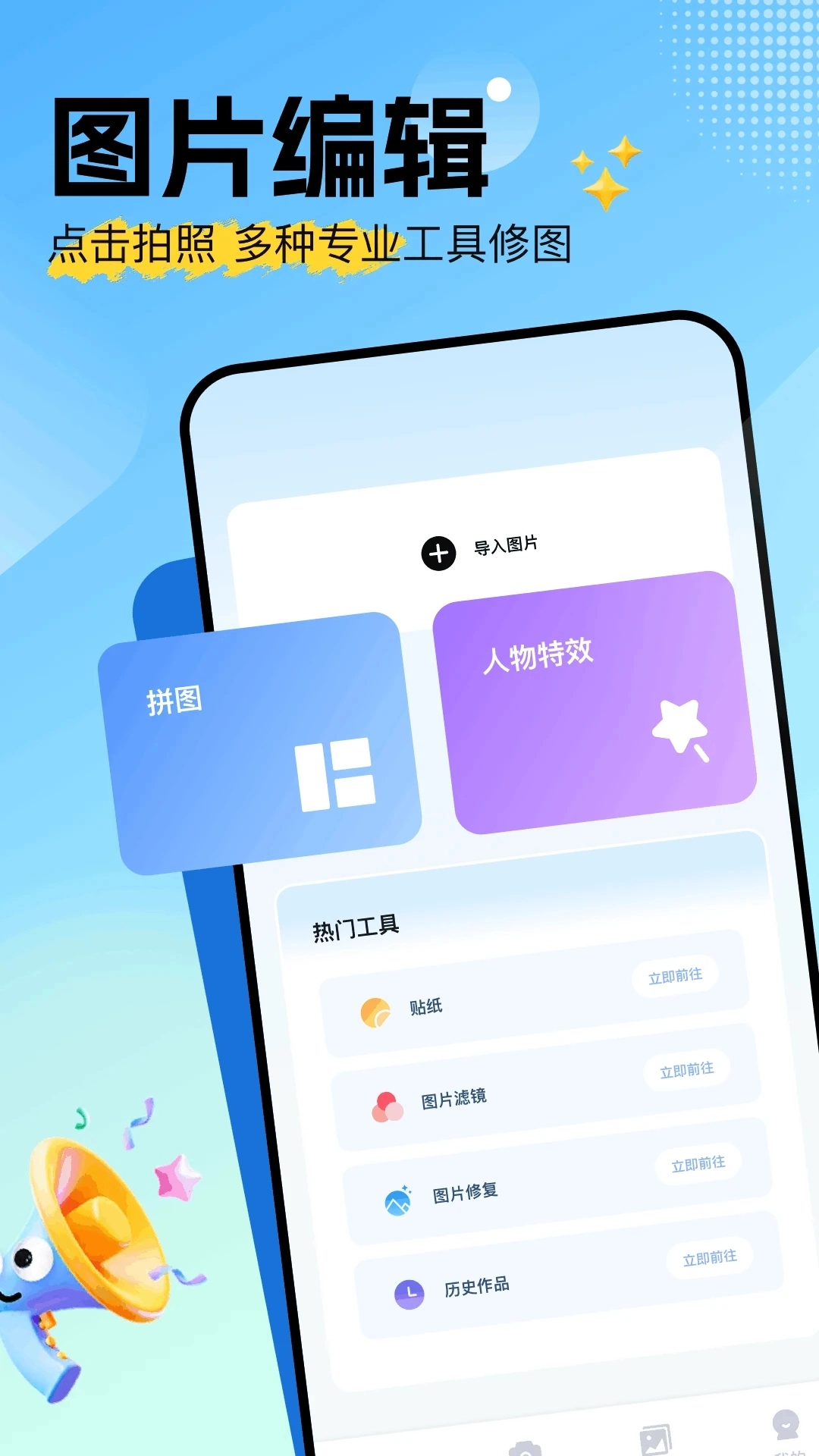 “趣看仓”凭借其强大的功能、便捷的操作以及创新的技术,已成为众多用户的首选图片处理工具。无论你是想要记录日常生活,还是进行专业的设计创作,这款应用都能为你提供全方位的支持。“趣看仓”,开启属于你的视觉创作之旅吧!趣看仓是一款功能丰富的图片处理应用,涵盖 图片编辑(支持拼图、人物特效等,多种专业修图工具)、美颜相机(高清拍摄,带美颜、滤镜等,记录美好瞬间)、私密相册(双重隐私保护,可管理、压缩图片,找回最近删除 )、图片修复(一键修复,还原清晰无损画质 ),满足日常图片拍摄、处理与管理需求 。