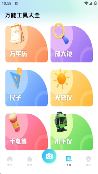 该工具集成了万年历、放大镜、尺子、光感仪、手电筒和水平仪等实用功能。