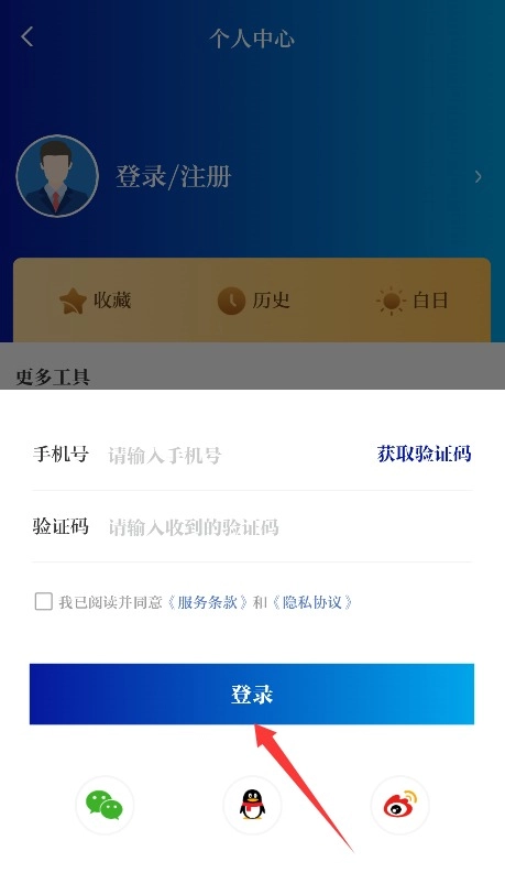 1、通过手机号获取验证码,输入收到的短信验证码后,勾选同意用户条款即可进入主界面。