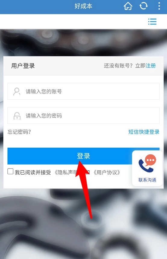1、打开好成本App后,会先进入登录界面,此时需要输入账号和密码,勾选相关协议,再点击蓝色的“登录”按钮,这样就能完成登录操作。